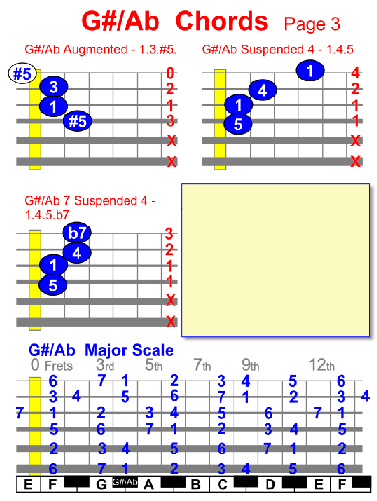 By viewing the Major Scale Diagram shown below you can find chords and scales in different positions, plus you can find chords and scales on piano/keyboard too.
