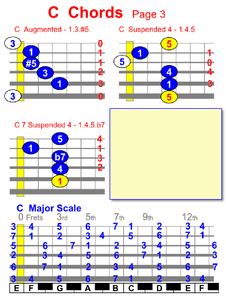 By viewing the Major Scale Diagram shown below you can find chords and scales in different positions, plus you can find chords and scales on piano/keyboard too.
