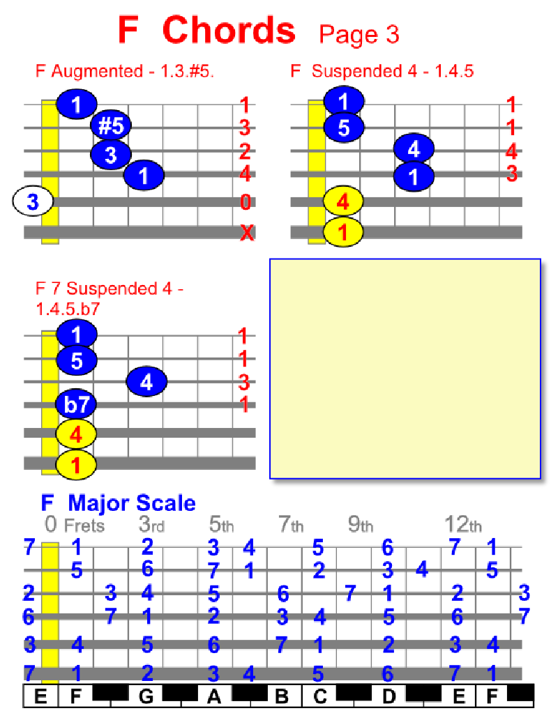 By viewing the Major Scale Diagram shown below you can find chords and scales in different positions, plus you can find chords and scales on piano/keyboard too.